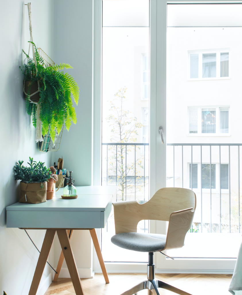 Short on time? Quick and simple interior updates could be exactly what’s needed to improve your working environment. Here, woodwork is instantly lifted with a lick of paint. Wooden coffee tables feel modern in charcoal black Smokescreen, and small desks stand out in Dreaming of the Day. Paired with plenty of plants, this is a perfect oasis for remote working in small studio apartments.