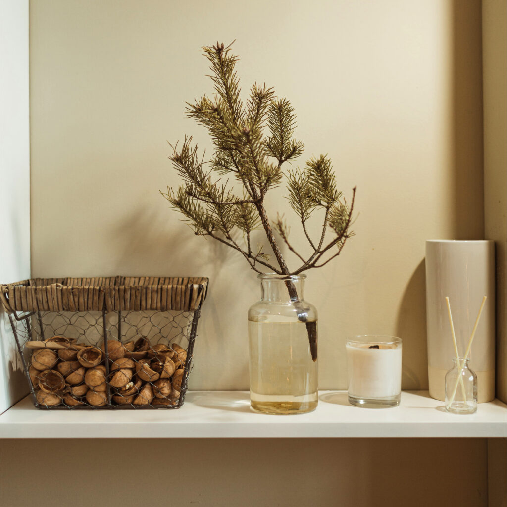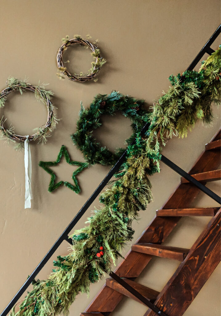 Simple and natural, give stairways a color update with Vintage Gold. Working towards a tone-on-tone scheme, invite the outside in and decorate with forest sprigs, leaves and twigs in organic greens and browns in wreathes and garlands.