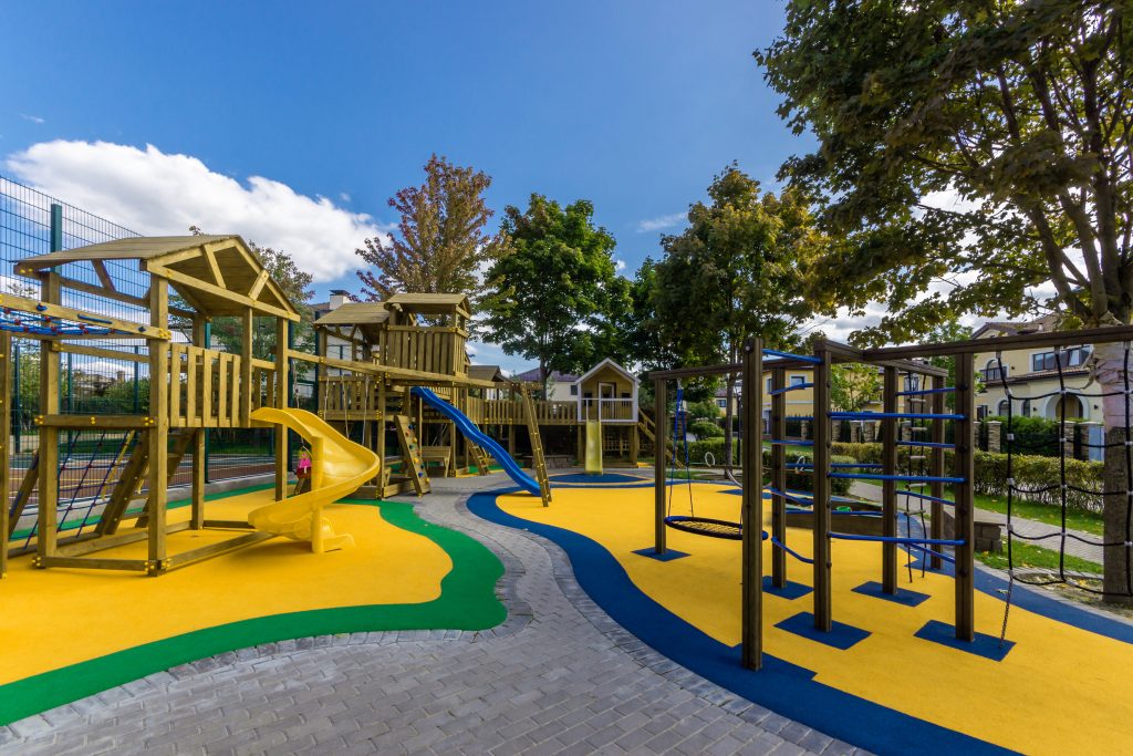 For an instantly welcoming and cheerful appearance, why not invest in bold color schemes for educational exteriors and child-friendly environments? Play areas are given a colorful makeover with path-finding shapes in Dandy Lion, Florida Waters and Aqueous. Here, the palette is used to transform a school’s façade. Neutral Pebblebrook is used as a base with eye-catching window frames in the palette’s primary and secondary hues.