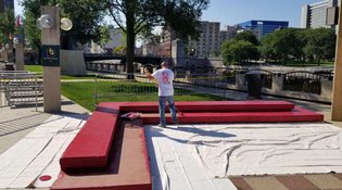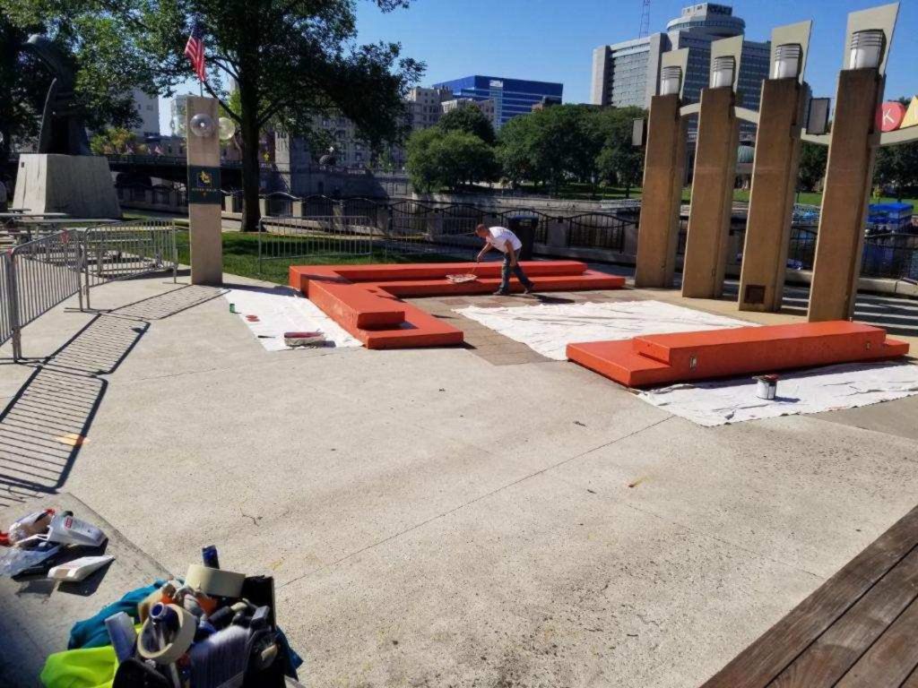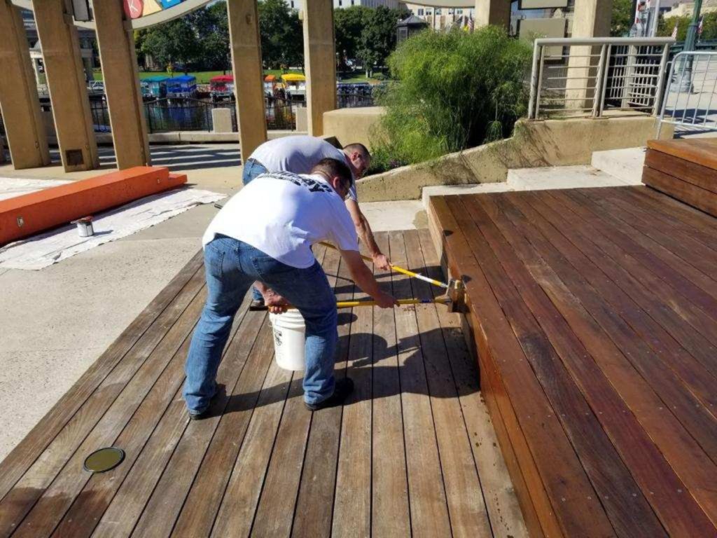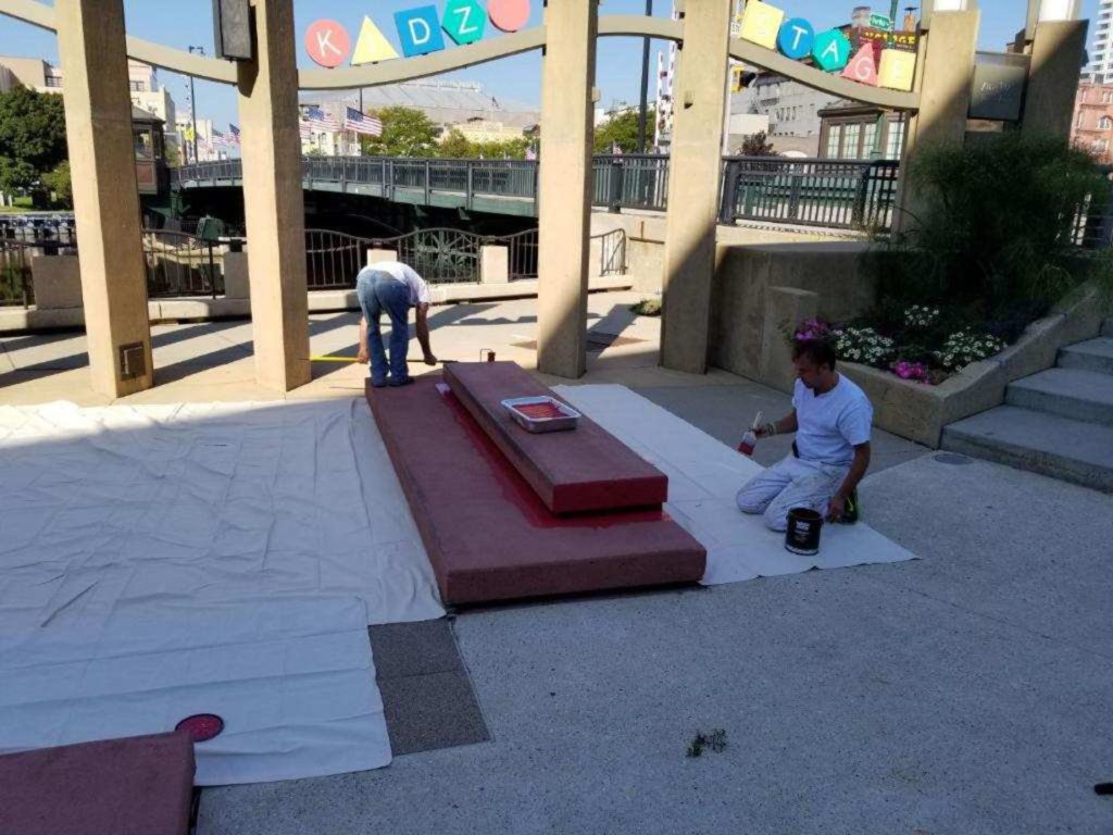 Milwaukee staff from Hallman Lindsay Paints recently volunteered under sunny September skies to give a facelift to the outdoor KidZ Stage at the Marcus Center For The Performing Arts. Weatherguard Lo-Sheen (174) was used on the concrete pads, and Cabot’s Wood Brightener and Australian Timber Oil were used on the teak and ironwood deck. Tony Kroll, Luke Lynch, Zach Voelker, Mike Nickel, Corey Burns, and John Heenan to refresh this area that provides free performances to over 3,000 kids. Great work on such a great venue!