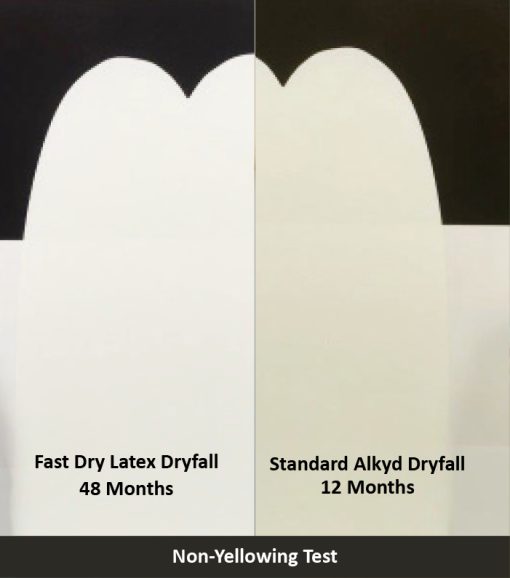 FAST DRY LATEX DRYFALL is an interior latex coating designed to improve lighting quality and aesthetics of interior spaces. This fast-drying film is designed for overhead application allowing for overspray to dry within 10 feet at 77ºF with 50% relative humidity for easy sweep clean-up. Low-odor waterborne technology has easy application with minimal air-quality impact on other trades or production. Standard formulation has increased levels of titanium dioxide for improved coverage, flash rust resistance, and improved light reflectance.